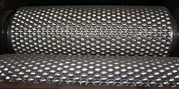 各種干粉物料從設備頂部加入,經脫氣、螺旋頂壓進入對輥,在對輥極大的擠壓力作用下使物料產生塑性變形而被壓縮成片狀。片狀物料在經過破碎、整粒、篩分等過程,得到顆粒狀產品。通過改變輥面開槽形式,可得到片狀、條狀、扁球狀物料。擠壓力的大小可根據造粒操作的需要由液壓油缸的壓力進行調節。